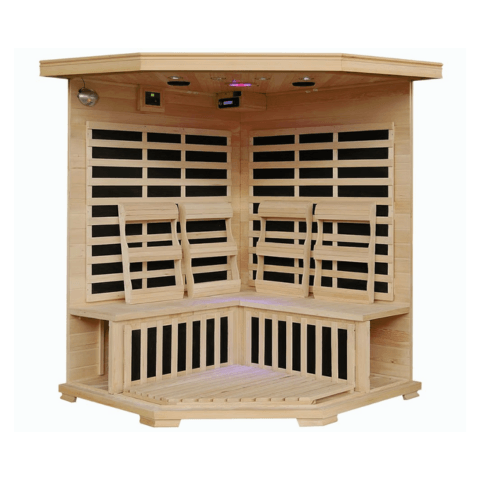 The HeatWave™ Tucson 4-Person Corner Infrared Sauna provides a relaxing and rejuvenating experience right at home, offering spacious seating while fitting conveniently into any corner. Made from natural Hemlock wood, its elegant design enhances any room decor. Featuring exclusive InfraWave FAR heat technology, the 10 carbon heaters emit ultra-low levels of EMF, ensuring a safe and effective sauna experience. The "EZ-Touch" dual LED control panels located inside and outside allow for easy temperature adjustments. Loaded with premium features including towel hooks, a magazine rack, CD player with mp3 plug-in, backrests, 7-color chromotherapy lighting, and an oxygen ionizer, the Tucson delivers a luxurious spa experience for you, your family, and friends. It operates up to 141°F, offering the ideal environment for stress relief and relaxation.